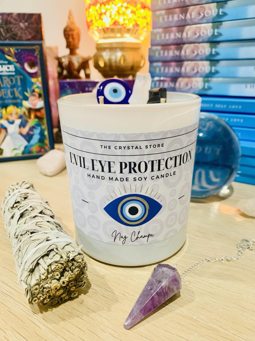 The Beautiful Third Eye Protection Candle Package includes a large, hand poured soy candle with a double cotton wick in the fragrant Nag Champa scent, along with a pendulum of your choosing and a white sage stick for cleansing. This package is perfect for protecting and preserving your energy and space.