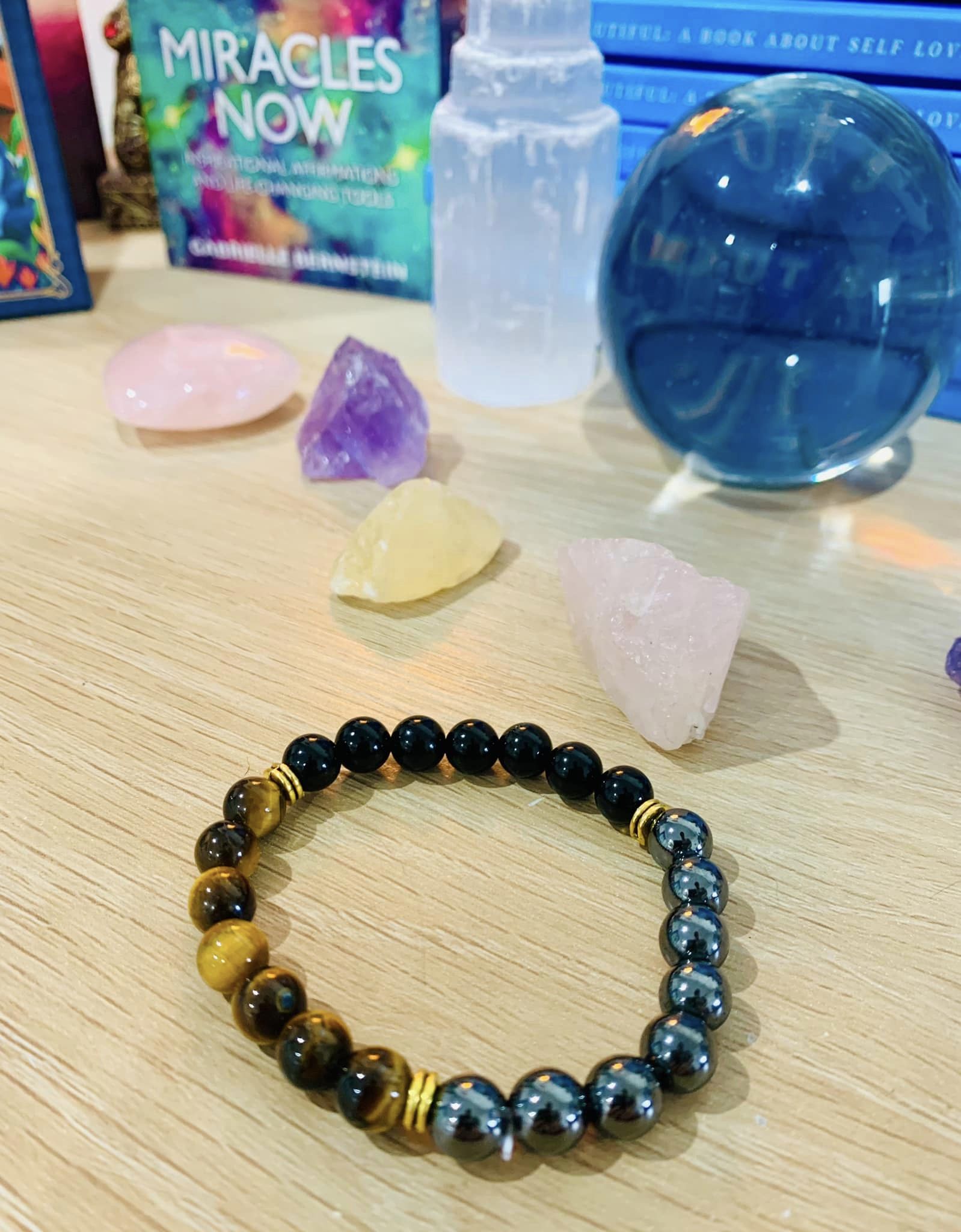 Triple Protection Gemstone Bracelet Tigers Eye Black Obsidian Tourmaline The Triple Protection Gemstone Bracelet combines three powerful gemstones - Tigers Eye, Black Obsidian, and Tourmaline - for ultimate protection and positivity. Feel confident and energized as you wear this stylish bracelet, knowing you are protected from negative energies and psychic attacks. Embrace the benefits of these gemstones while elevating your style and mindset. Trust in the power of the Triple Protection Gemstone Bracelet!